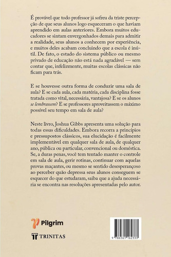 Neste livro, Joshua Gibbs apresenta uma solução para todas essas dificuldades. Embora recorra a princípios e pressupostos clássicos, sua elucidação é facilmente implementável em qualquer sala de aula, de qualquer ano, pública ou particular, convencional ou doméstica. Se, a duras penas, você tem tentado manter o controle em sala de aula, gerir rotinas, continuar com aquelas provas maçantes, ou mesmo se sentido desesperançoso ao perceber quão depressa seus alunos conseguem se esquecer do que estudaram, saiba que a ajuda necessária se encontra nas resoluções apresentadas pelo autor.