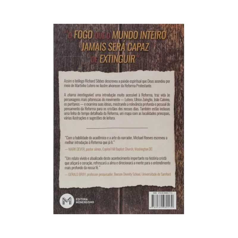 A chama inextinguível, uma introdução muito acessível à Reforma, traz vida às personagens mais pitorescas do movimento — Lutero, Ulrico Zuínglio, João Calvino, os puritanos — e examina suas ideias, mostrando a relevância profunda e pessoal do pensamento da Reforma para os cristãos dos nossos dias. Também estão inclusos uma linha do tempo detalhada da Reforma, um mapa com as localidades principais, várias ilustrações e sugestões de leitura.
