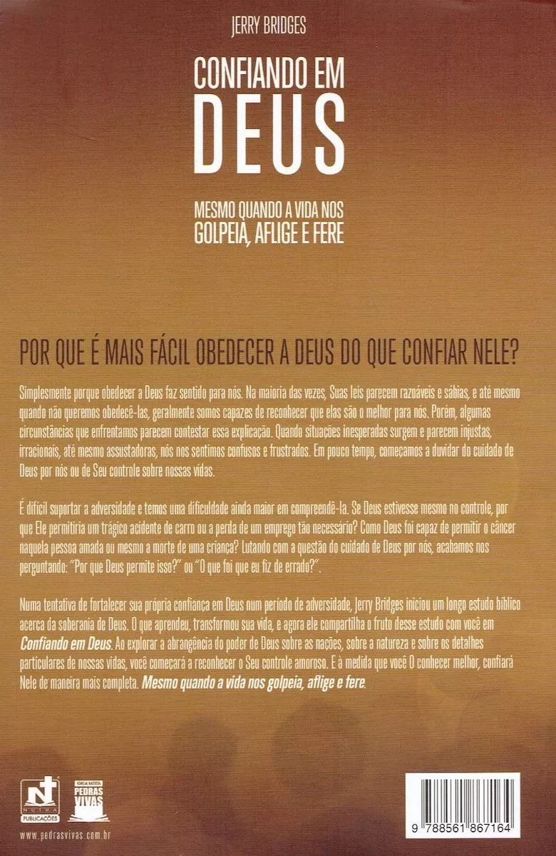 POR QUE É MAIS FÁCIL OBEDECER A DEUS DO QUE CONFIAR NELE? Simplesmente porque obedecer a Deus faz sentido para nós. Na maioria das vezes, Suas leis parecem razoáveis e sábias, e até mesmo quando não queremos obedecê-las, geralmente somos capazes de reconhecer que elas são o melhor para nós. Porém, algumas circunstâncias que enfrentamos parecem contestar essa explicação. Quando situações inesperadas surgem e parecem injustas, irracionais, ou até mesmo assustadoras, nós nos sentimos confusos e frustrados. Em pouco tempo, começamos a duvidar do cuidado de Deus por nós ou de Seu controle sobre nossas vidas. É difícil suportar a adversidade e temos uma dificuldade ainda maior em compreendê-la. Se Deus estivesse mesmo no controle, por que Ele permitiria um trágico acidente de carro ou a perda de um emprego tão necessário? Como Deus foi capaz de permitir o câncer naquela pessoa amada ou mesmo a morte de uma criança? Lutando com a questão do cuidado de Deus por nós, acabamos nos perguntando: Por que Deus permite isso? ou O que foi que eu fiz de errado?. Numa tentativa de fortalecer sua própria confiança em Deus num período de adversidade, Jerry Bridges iniciou um longo estudo bíblico acerca da soberania de Deus. O que aprendeu, transformou sua vida, e agora ele compartilha o fruto desse estudo com você em Confiando em Deus. Ao explorar a abrangência do poder de Deus sobre as nações, sobre a natureza e sobre os detalhes particulares de nossas vidas, você começará a reconhecer o Seu controle amoroso. E, à medida que você O conhecer melhor, confiará Nele de maneira mais completa. Mesmo quando a vida nos golpeia, aflige e fere.