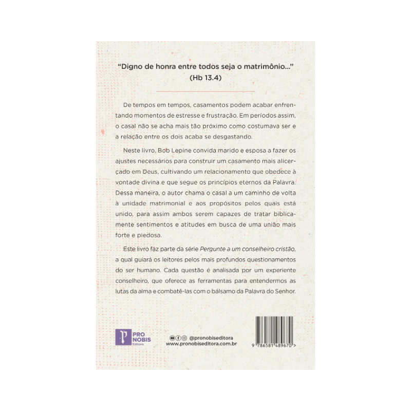 Neste livro, Bob Lepine convida marido e esposa a fazer os ajustes necessários para construir um casamento mais alicerçado em Deus, cultivando um relacionamento que obedece à vontade divina e que segue os princípios eternos da Palavra. Dessa maneira, o autor chama o casal a um caminho de volta à unidade matrimonial e aos propósitos pelos quais está unido, para assim ambos serem capazes de tratar biblicamente sentimentos e atitudes em busca de uma união mais forte e piedosa.