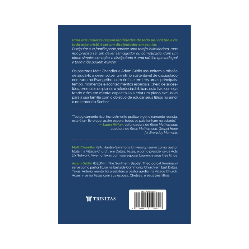 Os pastores Matt Chandler e Adam Griffin assumiram a missão de ajudá-lo a desenvolver um ritmo sustentável de discipulado centrado no Evangelho, com ênfase em três áreas principais: tempo, momentos e acontecimentos especiais. Cheio de sugestões, exemplos de planos e referências bíblicas, este livro começa tendo o fim em mente: capacitá-lo a criar um plano exclusivo para a sua família com o objetivo de educar seus filhos no amor e no temor do Senhor.