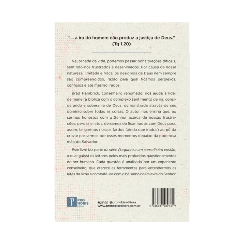 Brad Hambrick, conselheiro renomado, nos ajuda a lidar de maneira bíblica com o complexo sentimento de ira, considerando a soberania de Deus, demonstrada através de seu domínio sobre todas as coisas. O autor nos ensina que, ao sermos honestos com o Senhor acerca de nossas frustrações, perdas e lutos, deixamos de ficar com raiva de Deus para, assim, lançarmos nossos fardos (ainda que irados) ao pé da cruz e passarmos por esses momentos debaixo da poderosa mão do Salvador.