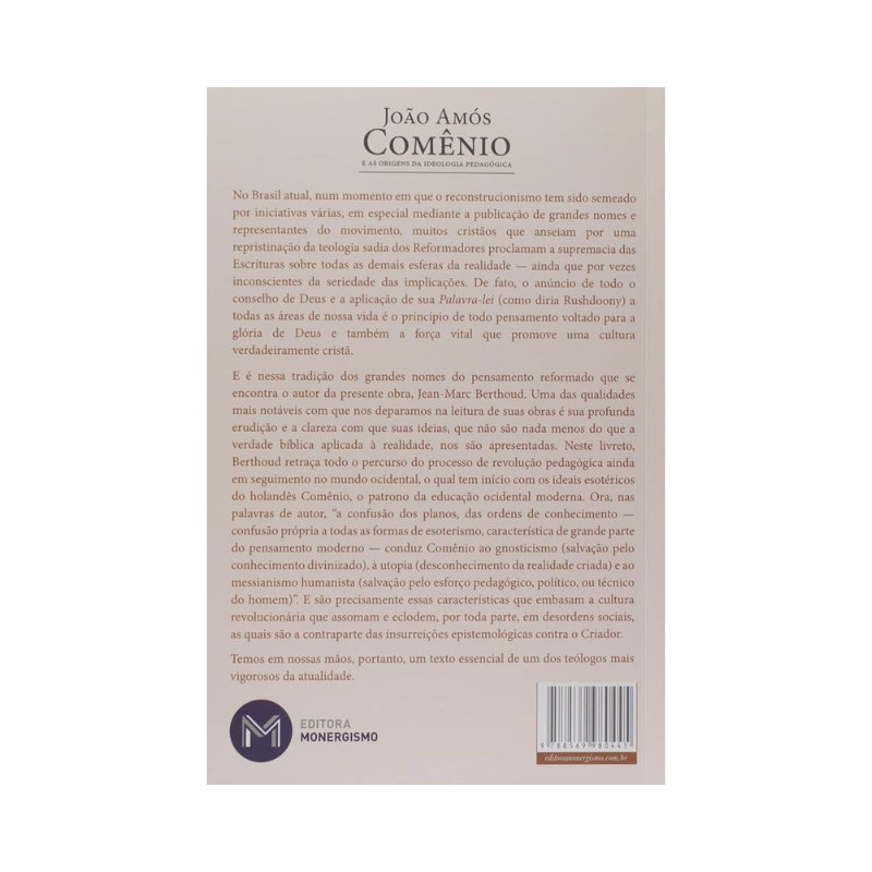 E é nessa tradição dos grandes nomes do pensamento reformado que se encontra o autor da presente obra, Jean-Marc Berthoud. Uma das qualidades mais notáveis com que nos deparamos na leitura de suas obras é sua profunda erudição e a clareza com que suas ideias, que não são nada menos do que a verdade bíblica aplicada à realidade, nos são apresentadas. Neste livreto, Berthoud retraça todo o percurso do processo de revolução pedagógica ainda em seguimento no mundo ocidental, o qual tem início com os ideais esotéricos do holandês Comênio, o patrono da educação ocidental moderna. Ora, nas palavras de autor, ?a confusão dos planos, das ordens de conhecimento ? confusão própria a todas as formas de esoterismo, característica de grande parte do pensamento moderno ? conduz Comênio ao gnosticismo (salvação pelo conhecimento divinizado), à utopia (desconhecimento da realidade criada) e ao messianismo humanista (salvação pelo esforço pedagógico, político, ou técnico do homem)?. E são precisamente essas características que embasam a cultura revolucionária que assomam e eclodem, por toda parte, em desordens sociais, as quais são a contraparte das insurreições epistemológicas contra o Criador.