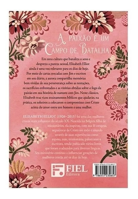 Em uma cultura que banaliza o sexo e despreza a pureza sexual, Elisabeth Elliot ainda é uma voz relevante para os dias de hoje. Por meio de cartas trocadas com Jim e escritos em seu diário, a autora compartilha memórias bem vívidas de sua perseverança sobre as tentações, os sacrifícios enfrentados e as vitórias obtidas sobre o fogo da paixão em sua história de namoro com Jim. Neste clássico, Elisabeth traz ricos ensinamentos bíblicos que ajudarão, na prática, os solteiros a colocarem o compromisso com Cristo acima do amor entre um homem e uma mulher.