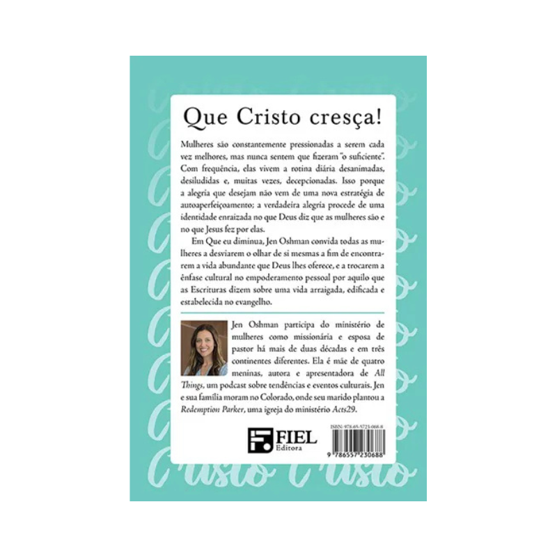 Em Que eu diminua, Jen Oshman convida todas as mulheres a desviarem o olhar de si mesmas a fim de encontrarem a vida abundante que Deus lhes oferece, e a trocarem a ênfase cultural no empoderamento pessoal por aquilo que as Escrituras dizem sobre uma vida arraigada, edificada e estabelecida no evangelho.
