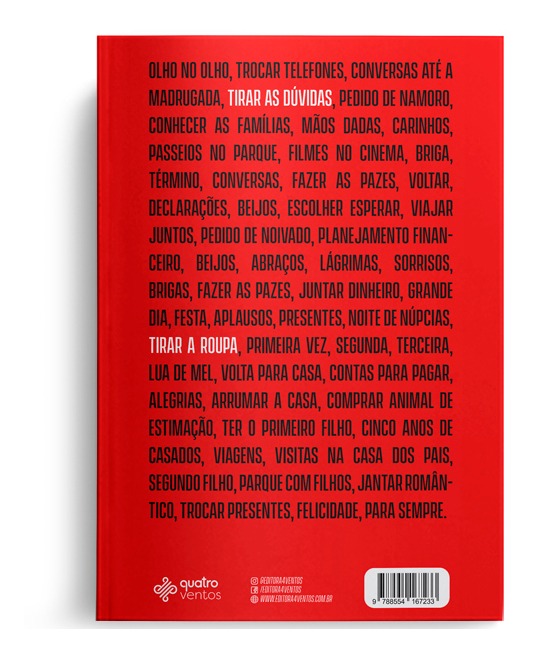 Olho no olho, trocar telefalas, conversas até a madrugada, tirar as dúvidas, pedido de namoro, conhecer as famílias, mãos dadas, carinhos, passeios no parque, filmes no cinema, briga, término, conversas, fazer as pazes, voltar, declarações, beijos, escolher esperar, viajar juntos, pedido de noivado, planejamento financeiro, beijos, abraços, lágrimas, sorrisos, brigas, fazer as pazes, juntar dinheiro, grande dia, festa, aplausos, presentes, noite de núpcias, tirar a roupa, primeira vez, segunda, terceira, lua de mel, volta para casa, contas para pagar, alegrias, arrumar a casa, comprar animal de estimação, ter o primeiro filho, cinco anos de casados, viagens, visitas na casa dos pais, segundo filho, parque com filhos, jantar romântico, trocar presentes, felicidade, para sempre.