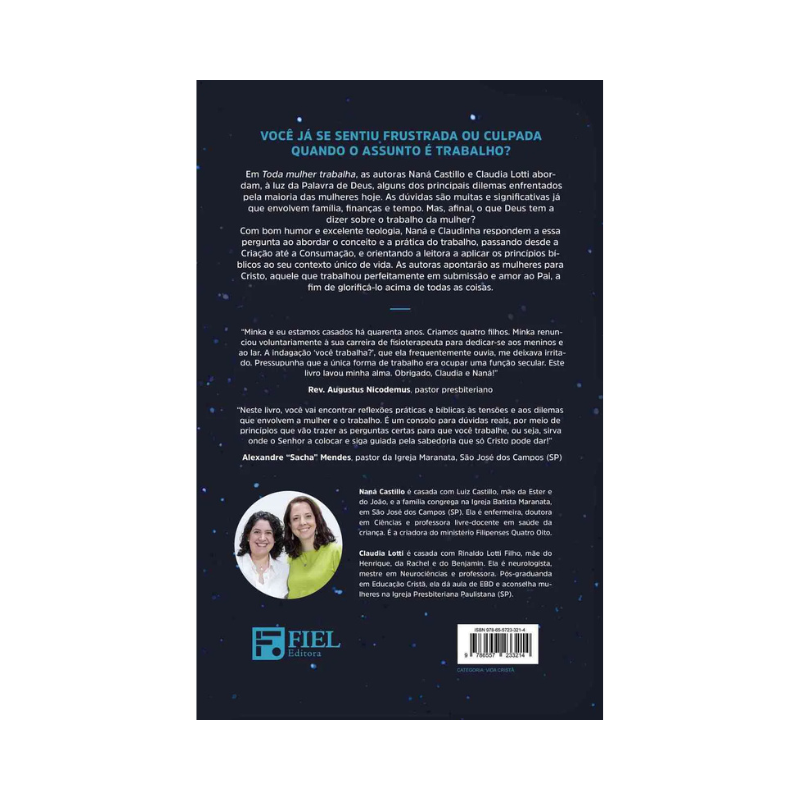 Em “Toda mulher trabalha”, as autoras Naná Castillo e Claudia Lotti abordam, À luz da Palavra de Deus, alguns dos principais dilemas enfrentados pela maioria das mulheres de hoje. As dúvidas são muitas e significativas já que envolvem família, finanças e tempo. Mas, afinal, o que Deus tem a dizer sobre o trabalho da mulher? Com bom humor e excelente teologia, Naná e Claudinha respondem a essa pergunta ao abordar o conceito e a prática do trabalho, passando desde a Criação até a Consumação, e orientando a leitora a aplicar os princípios bíblicos ao seu contexto único de vida. As autoras apontarão as mulheres para Cristo, aquele que trabalhou perfeitamente em submissão e amor ao Pai, a fim de glorificá-lo acima de todas as coisas.